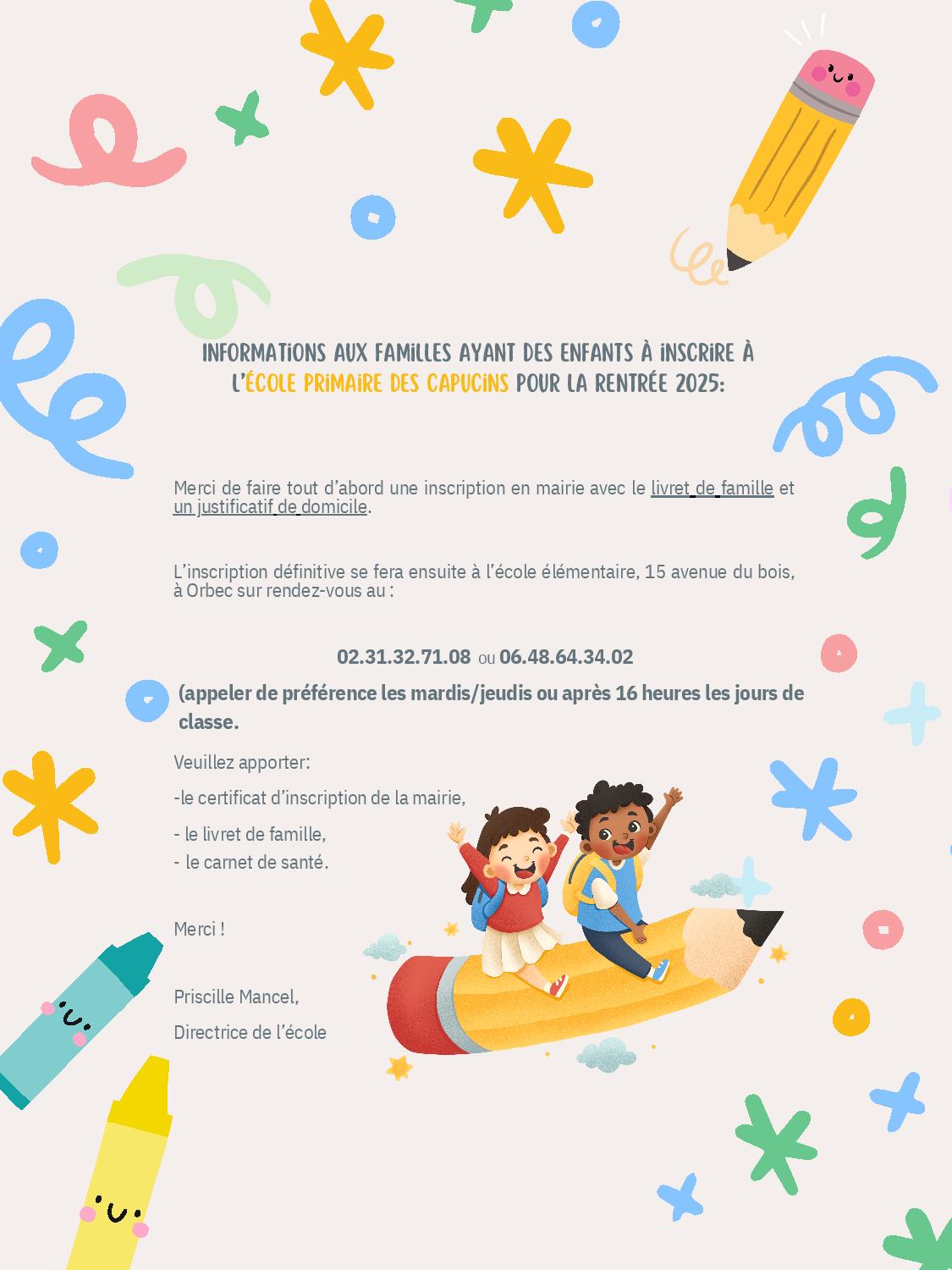 L’inscription de votre enfant à l’école primaire des Capucins (publique) peut se faire dès maintenant pour la rentrée 2025. Il vous suffit de passer en mairie, muni du livret de famille et d’un justificatif de domicile récent.